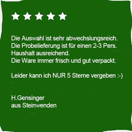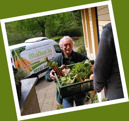 Wir liefern eine abwechslungsreiche Biobus-Kiste mit Obst und Gemüse im Wert von ca. 25 Euro. Die 6. Kiste kommt gratis !