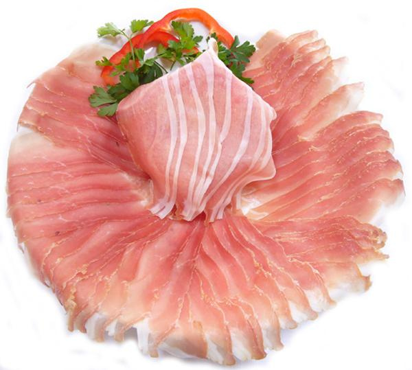 Heraus kommt ein würziger, trockener Schinken, der eine feste Struktur besitzt und den man hauchdünn schneiden kann.