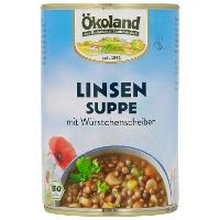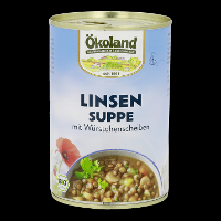 Trinkwasser, 19% Linsen*, Fleisch (Schwein*, Rind*), Karotten*, Kartoffeln*, Zwiebeln*, Lauch*, SELLERIE*, Sonnenblumenöl*, Steinsalz, Maisstärke*, Rohrohrzucker*, WEIZENMEHL*, Meersalz, Verdickungsmittel: Guarkernmehl*; Tomatenmark*, Branntweinessig*, Gewürze* (Macis*, Curcuma*, Pfeffer*, Ingwer*, Knoblauch*, Koriander*, Kümmel*), Kräuter*(Liebstöckel*, Petersilie*, Rosmarin*), Dextrose*, Schafsaitling, Rauch.| Energie | Fett | gesättigte Fettsäuren | Kohlenhydrate | Zucker | Ballaststoffe | Eiweiss | Salz |