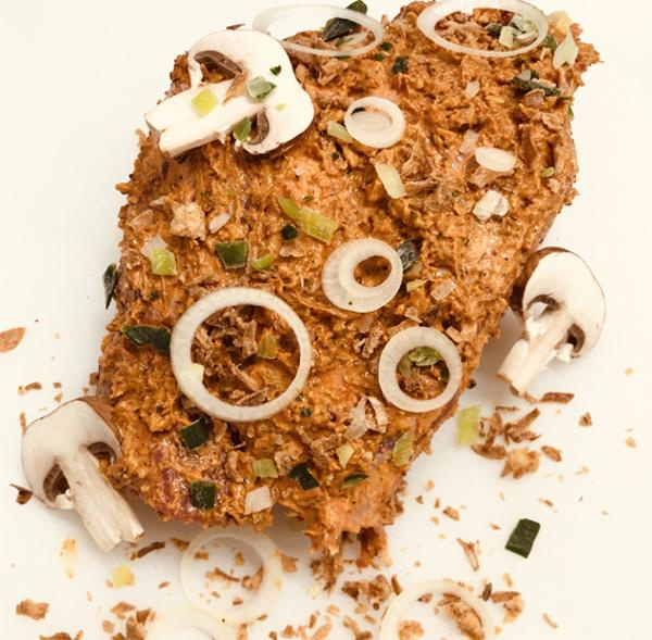 Schweinefleisch (Schweinenuß)**, Marinade(Sonnenblumenöl*, Palmfett*, Meersalz, Gewürze*) Röstzwiebeln*, Champignons*