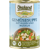 Trinkwasser, 24% Gemüse* - in veränderlichen Gewichtsanteilen (Karotten*, SELLERIE*, Erbsen*, Lauch*, Brechbohnen*), 9% Hühnerfleisch* gegart, 2% Nudeln* (HARTWEIZENGRIESS*) (Trockeneinwaage), Sonnenblumenöl*, Steinsalz, Maltodextrin*, Zwiebeln*, Maisstärke*, Meersalz, Gewürze* (Muskat*, Curcuma*, Knoblauch*, Pfeffer*), Kräuter* (Liebstöckel*, Petersilie*).| Energie | Fett | gesättigte Fettsäuren | Kohlenhydrate | Zucker | Ballaststoffe | Eiweiss | Salz |