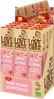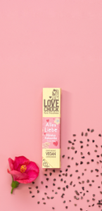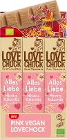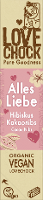 Kakaobutter* (42%), Reisdrinkpulver* (Reis*, Sonnenblumenöl*, Beta-Glucan*, Salz), Kokosblütenzucker*, getrocknete Cranberries*, rohe Kakaosplitter* (5%), Hibiskuspulver* (1,7%), Emulgator (Sonnenblumen-Lecithin*), Vanillepulver*.| Energie | Fett | gesättigte Fettsäuren | Kohlenhydrate | Zucker | Ballaststoffe | Eiweiss | Salz |