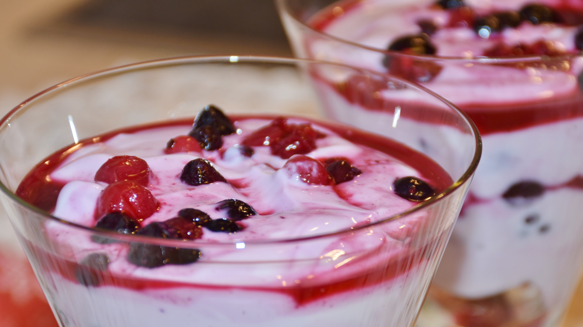Das Früchtepüree und die Mascarponecreme im Wechsel in einem Glas schichten. Beginnend mit der Mascarponecreme.