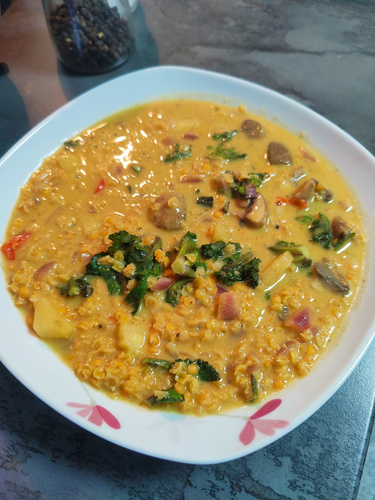 Die Linsen und Champignons dazu geben und für etwa 10 – 12 Minuten köcheln lassen bis die Linsen weich sind.