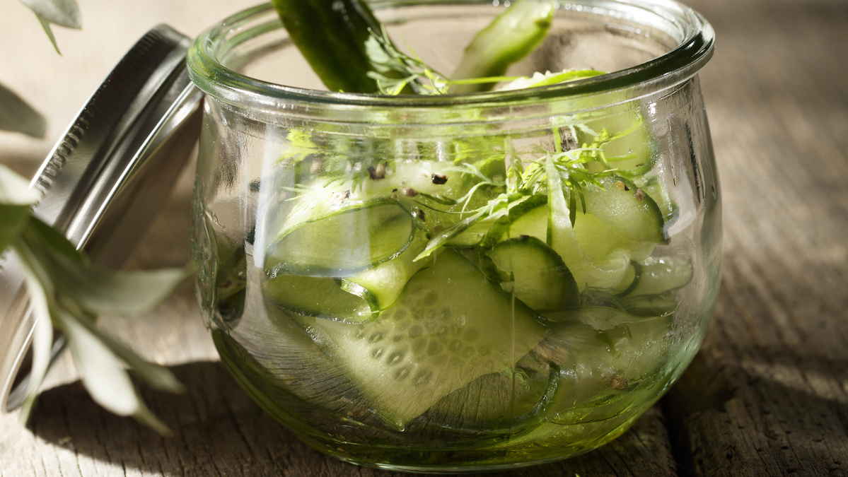 Die Zwiebel schälen, in halbe Ringe schneiden und zu den Gurken geben.