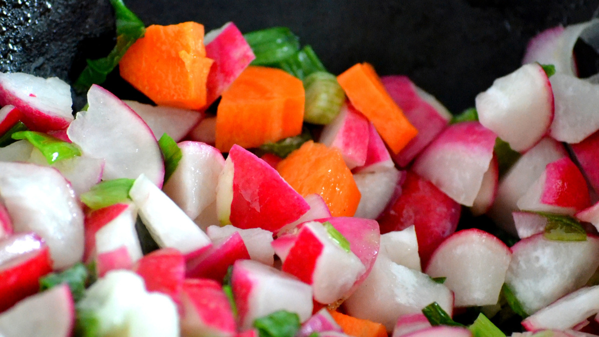 Die Butter in einem Topf erhitzen und circa 3/4 der Radieschen und die Schalotten hinzufügen. Bei schwacher Hitze andünsten.