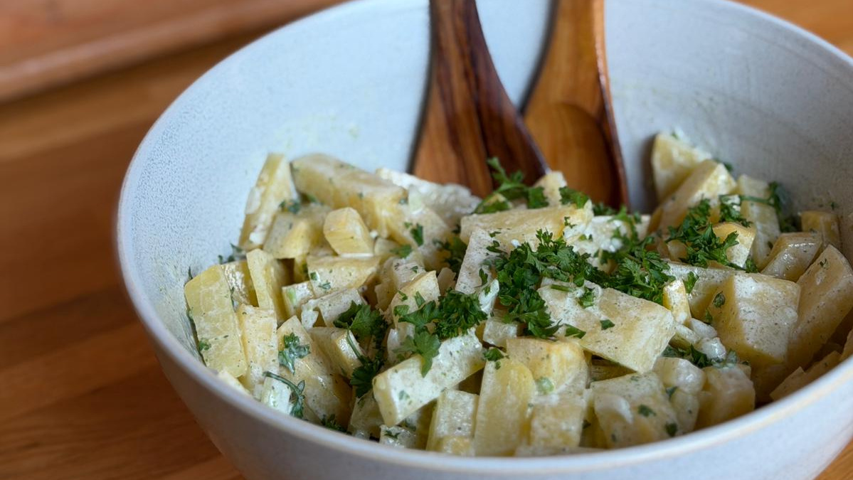 Die gekochten Steckrüben Stifte abschütten und mit dem Dressing vermischen und 1-2 Stunden ziehen lassen.